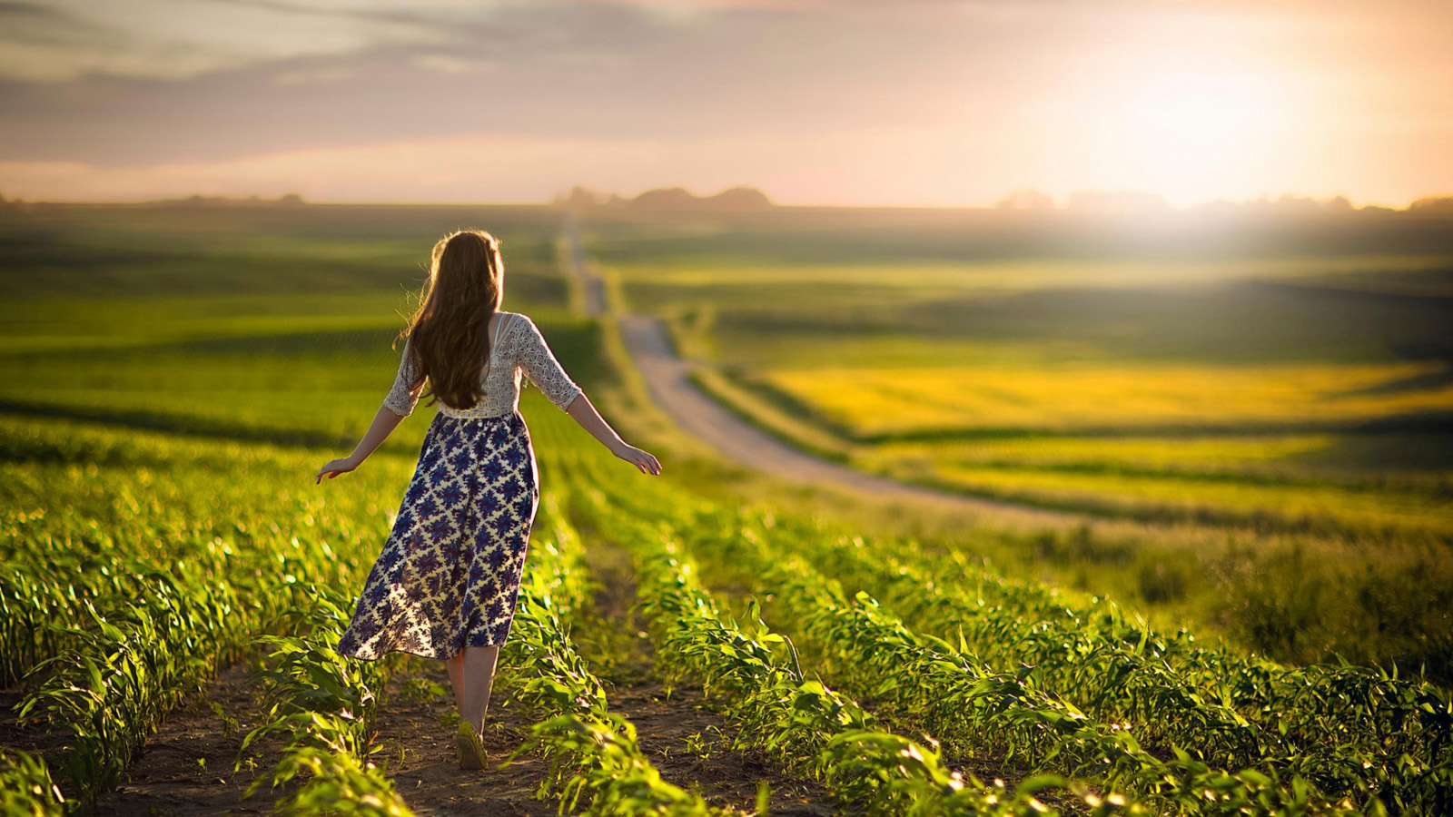 农场,女孩,裙子,公路,背景,唯美壁纸