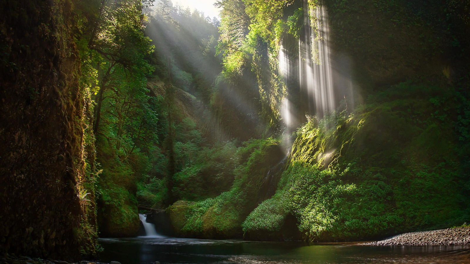 瀑布,森林,山谷,阳光,自然风光桌面壁纸
