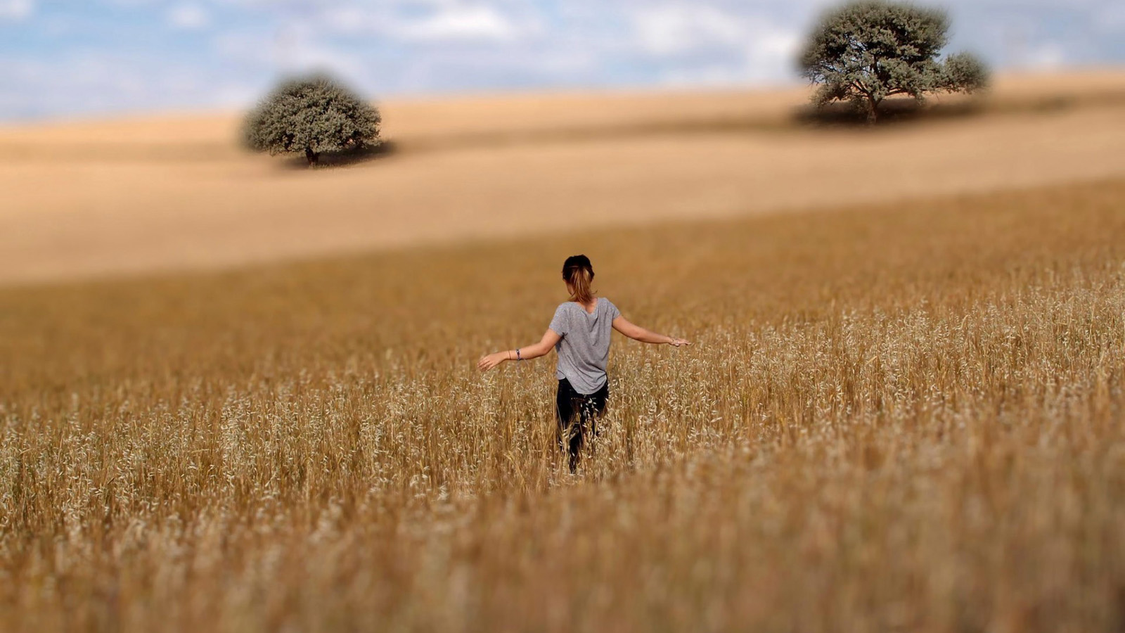 女孩,背影,树木,田园,麦场,自然,意境,桌面壁纸