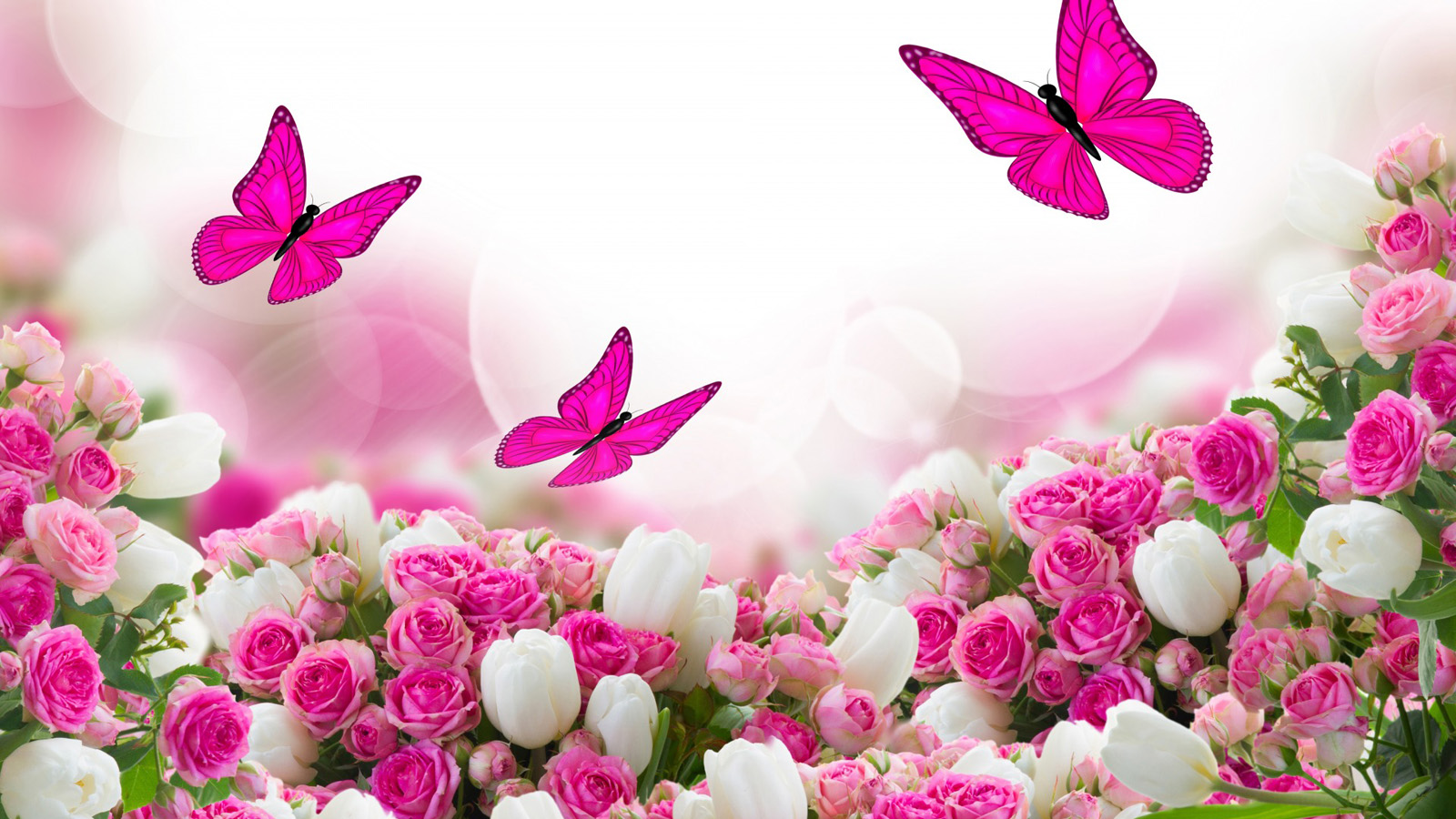 玫瑰,郁金香,叶,花,蝴蝶,鲜花,桌面壁纸