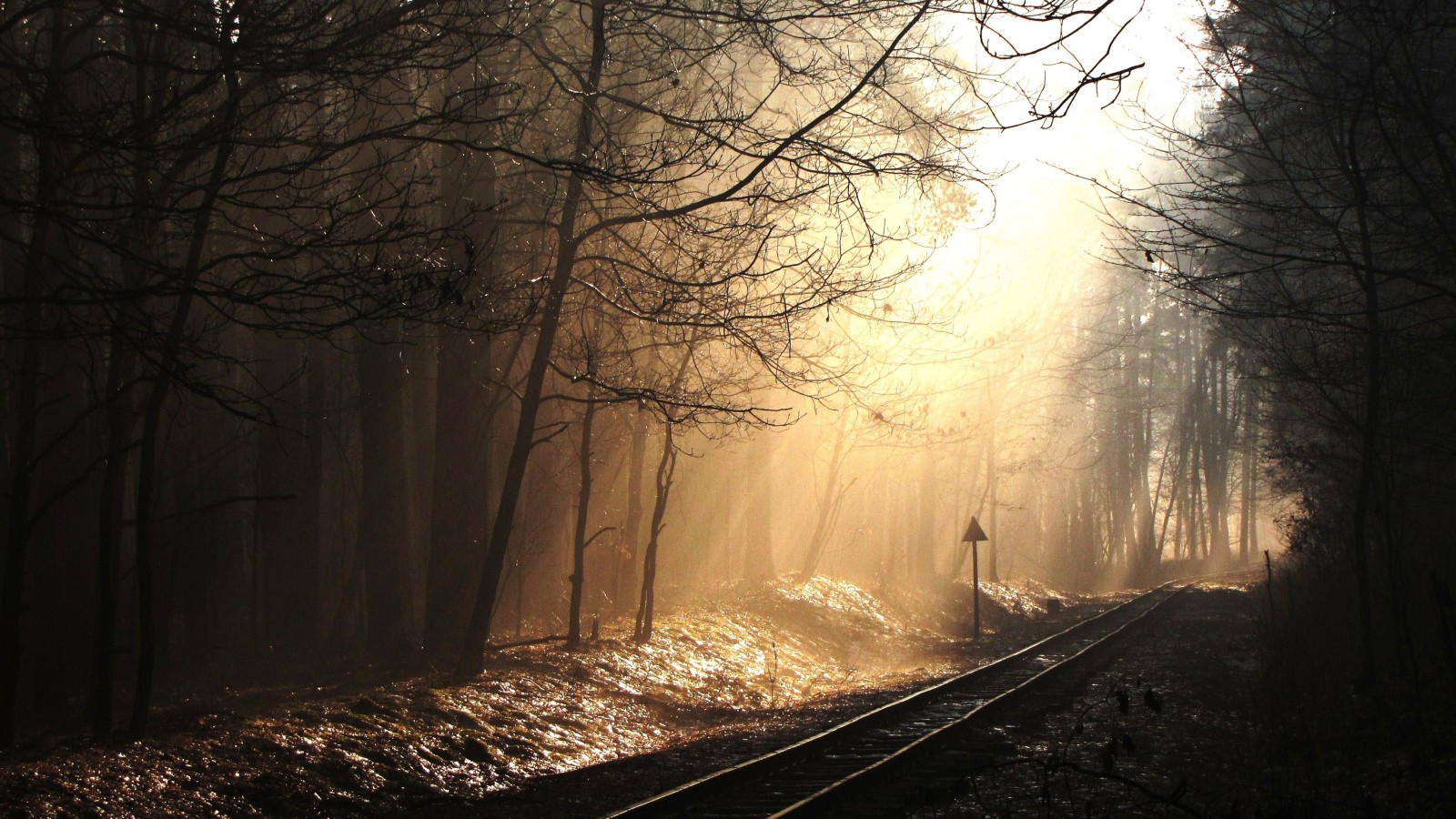 火车,轨道,树木,树林,阳光,寂静,风景桌面壁纸