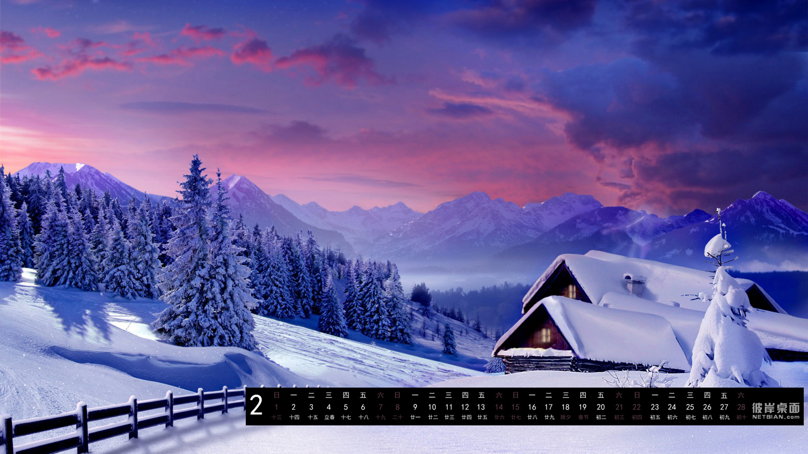 彼岸2015年2月日历桌面壁纸,冬天,雪景,树木,小屋