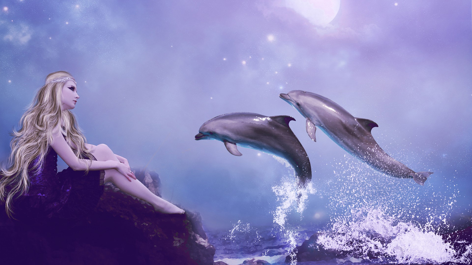幻想,女孩,坐在海边岩石上,金发女郎,海浪,海豚,幻想,唯美壁纸