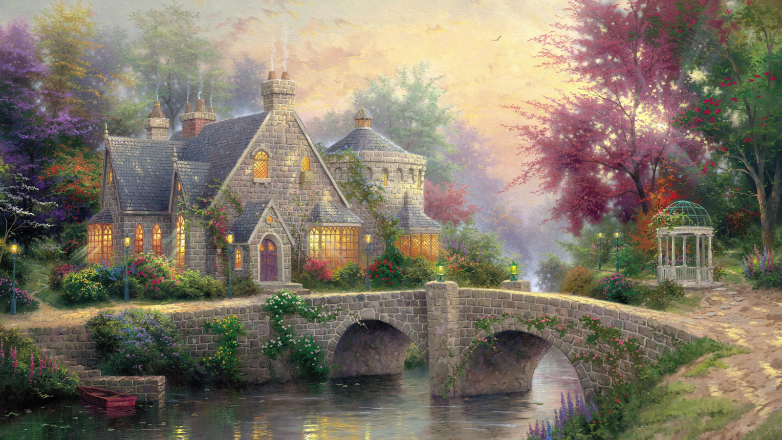 灯光庄园,托马斯·金凯德,绘画,艺术,桥,精美风景画,桌面壁纸