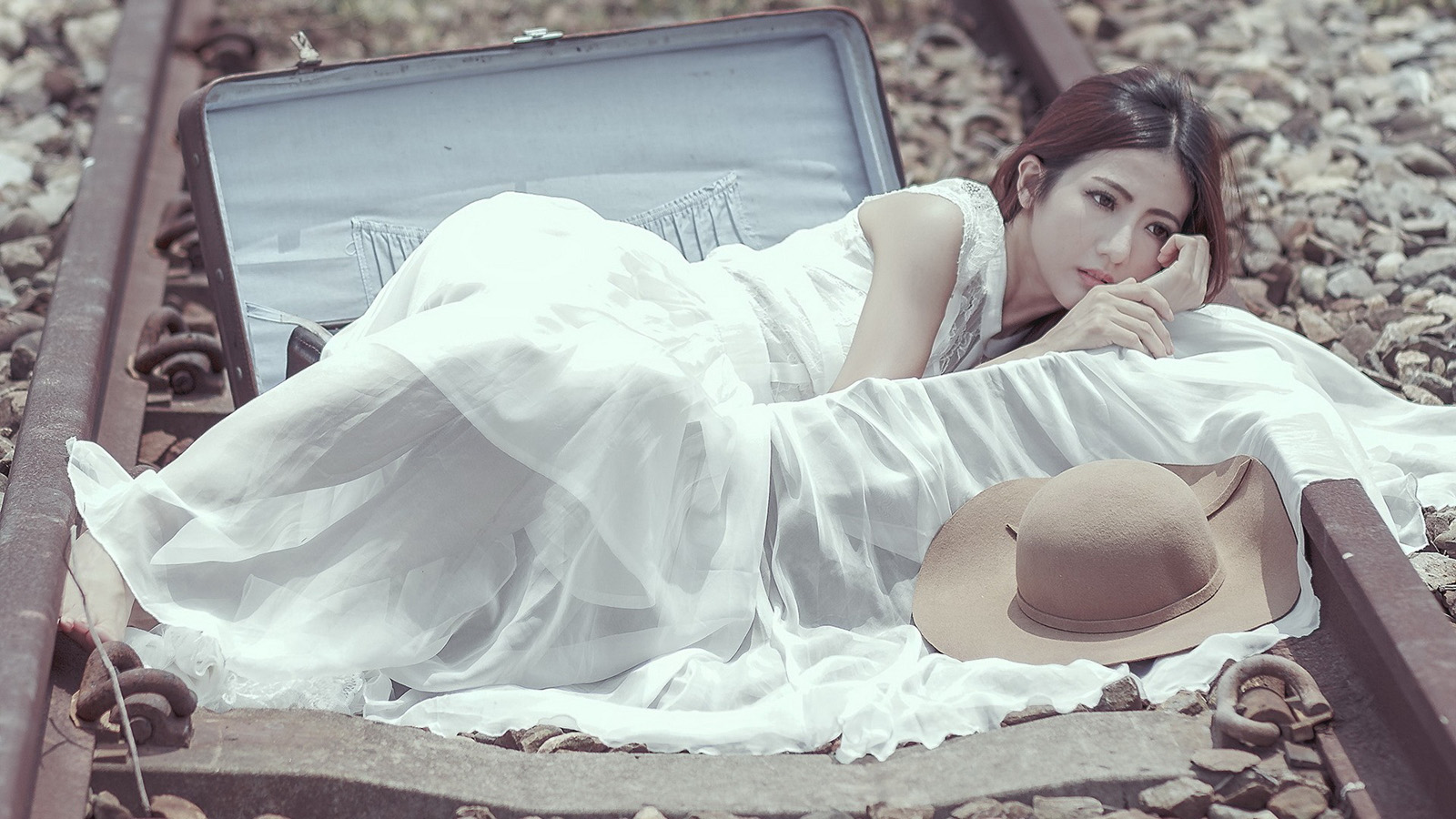 火车,轨道,美女,白色裙子,帽子,箱,姿势,摄影,壁纸