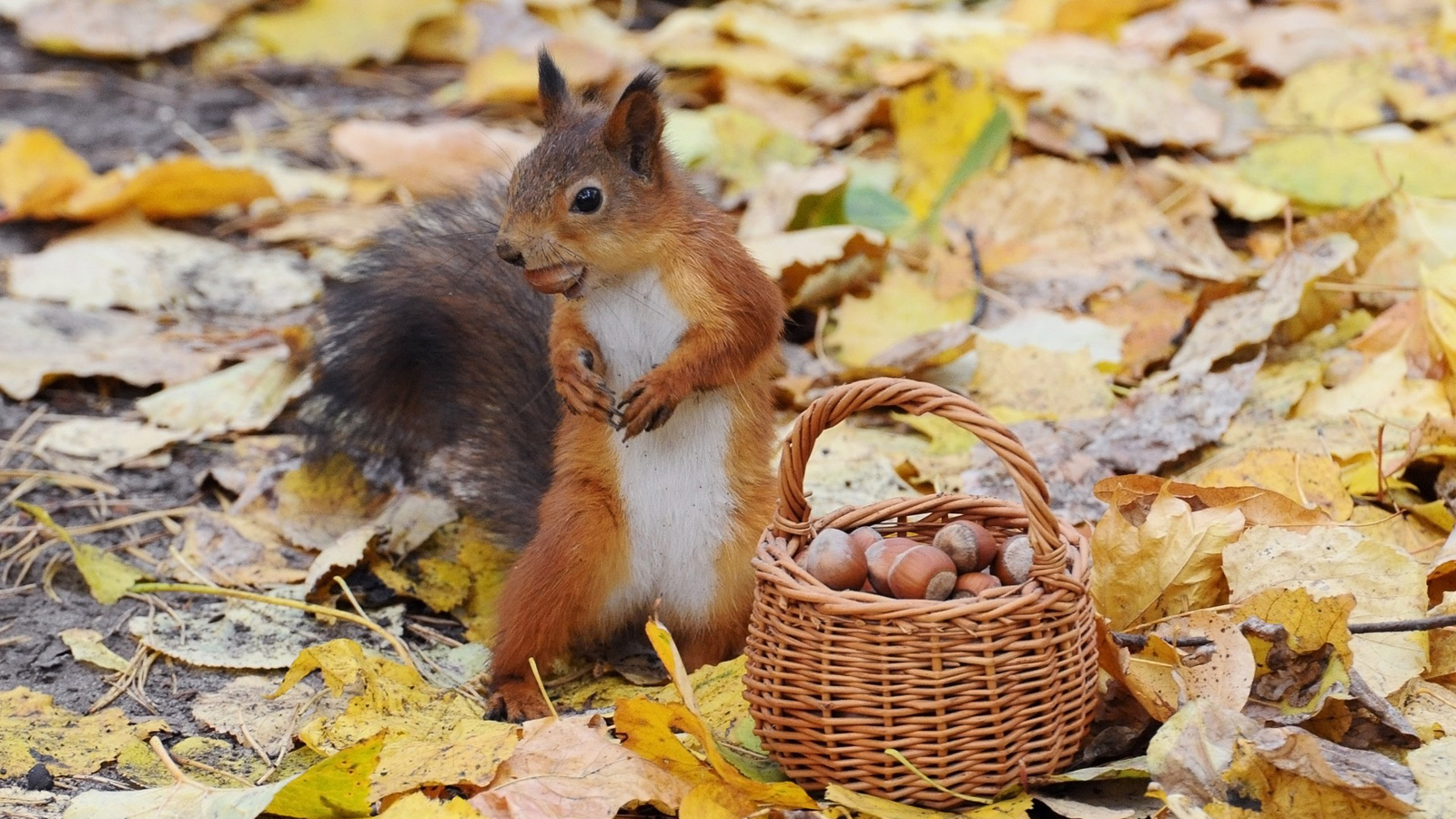 秋天,小松鼠,可爱姿势,篮子,坚果,松鼠壁纸