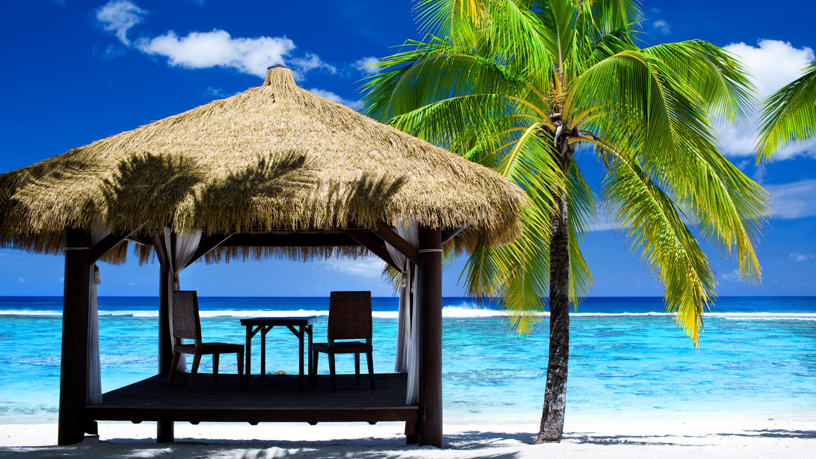 沙滩,大海,夏天,乔木,沙滩,海岸,小屋,风景桌面壁纸