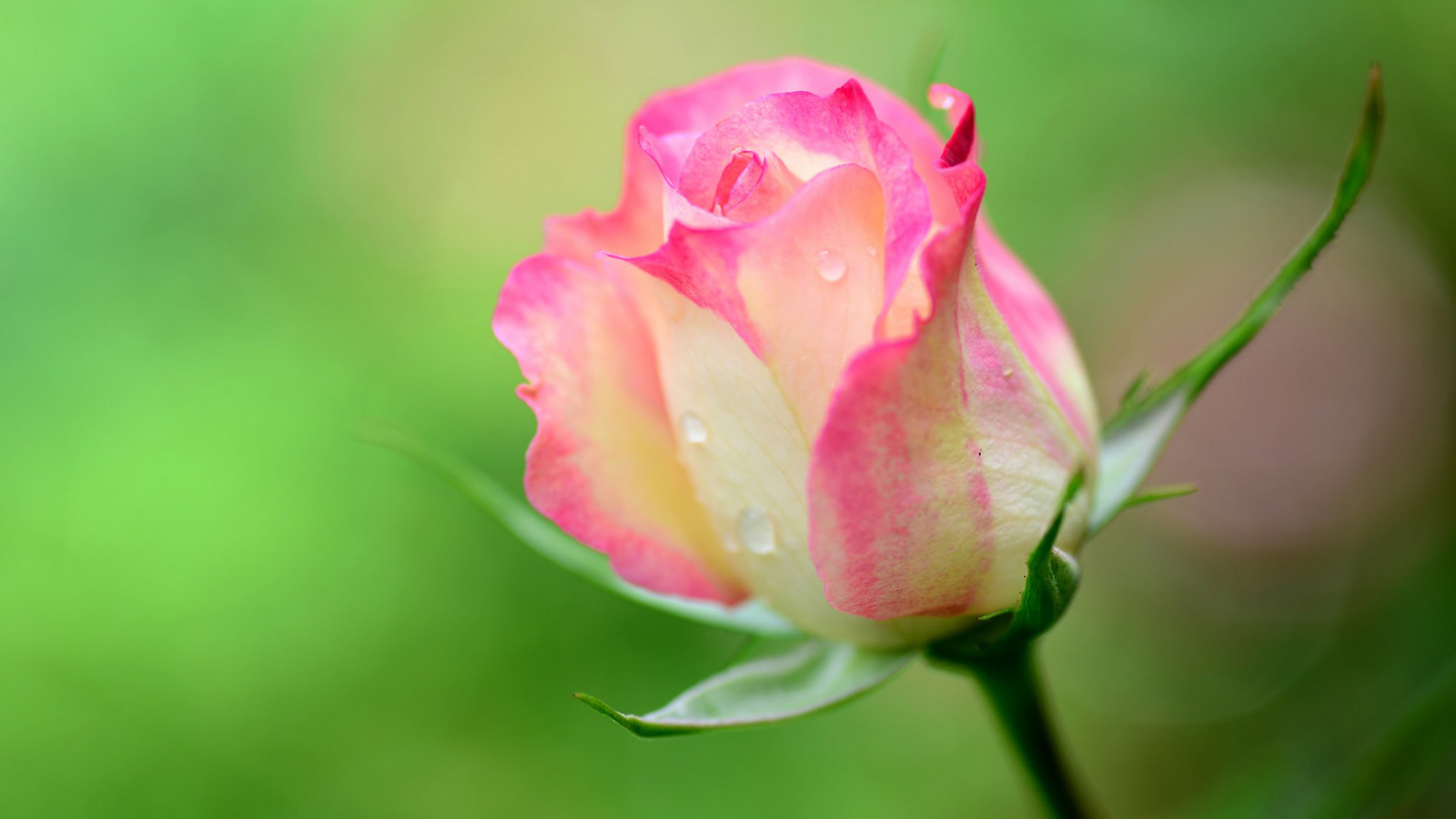 玫瑰,花蕾,粉色花瓣,水滴,露珠,绿色背景,护眼桌面壁纸