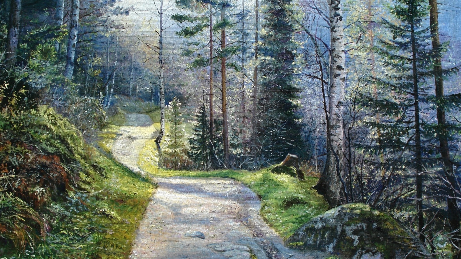 森林,树,小路,石头,精美绘画风景桌面壁纸