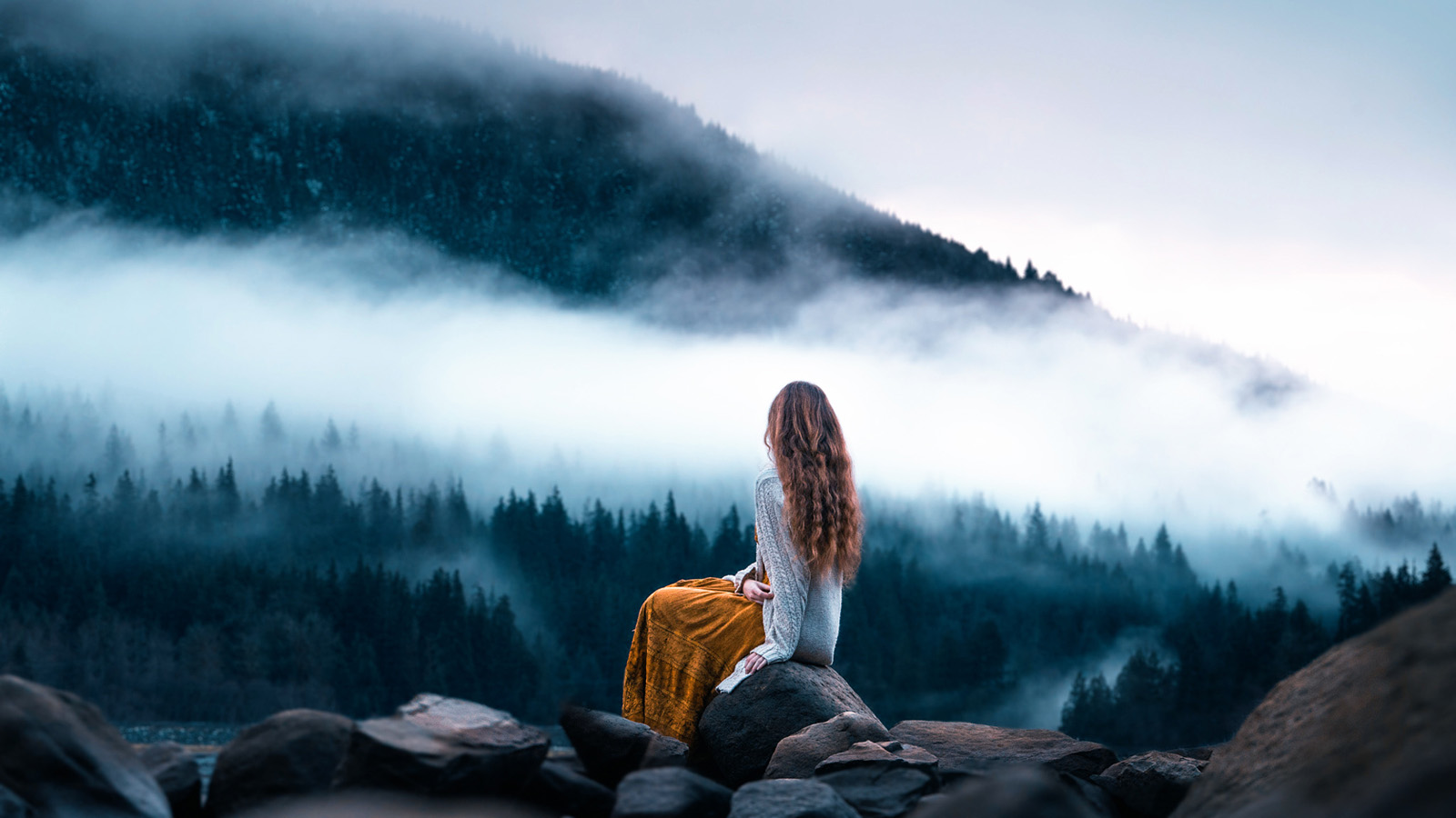 早晨风景,山里,雾,石头,漂亮卷发女孩,安静唯美壁纸