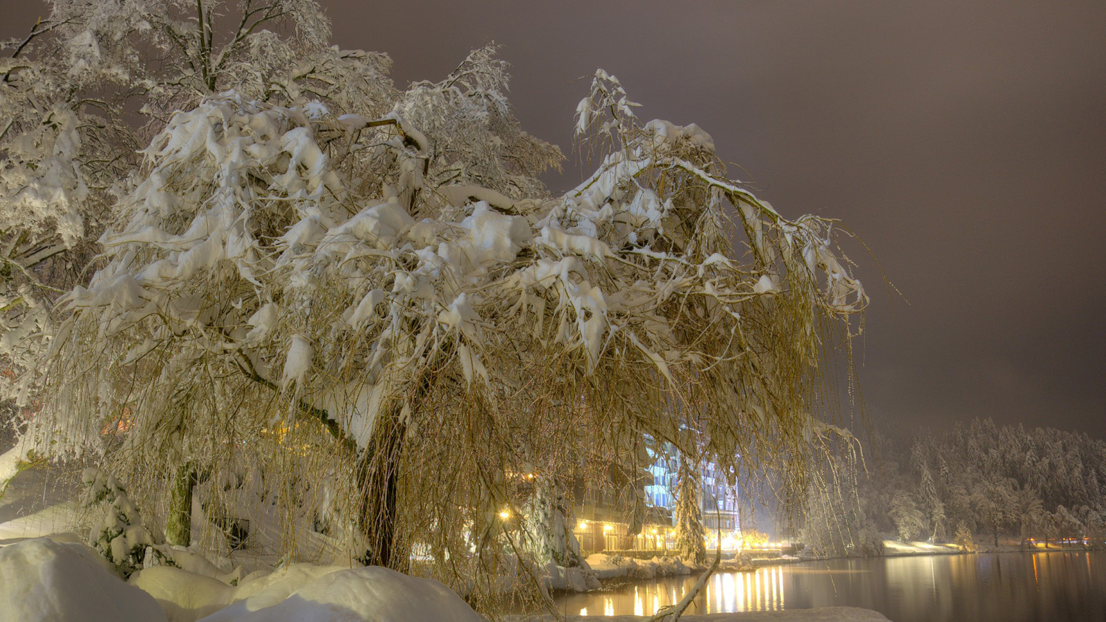 夜晚,冬天,雪,河流,雪堆,风景桌面壁纸