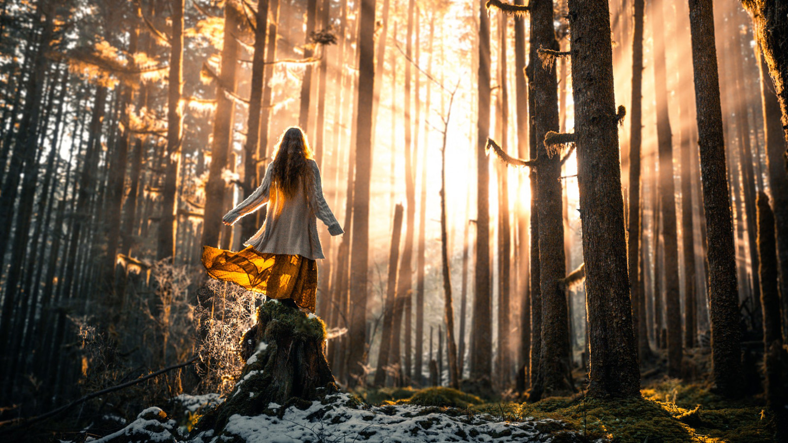 森林,雪,太阳,卷发女孩,唯美意境桌面壁纸
