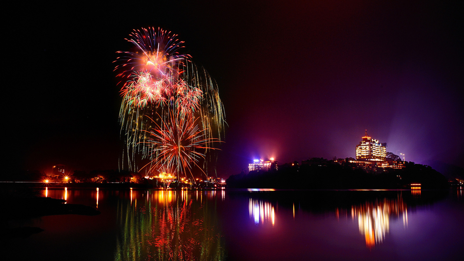 城市夜景,灯,湖,烟花爆竹,假期桌面壁纸