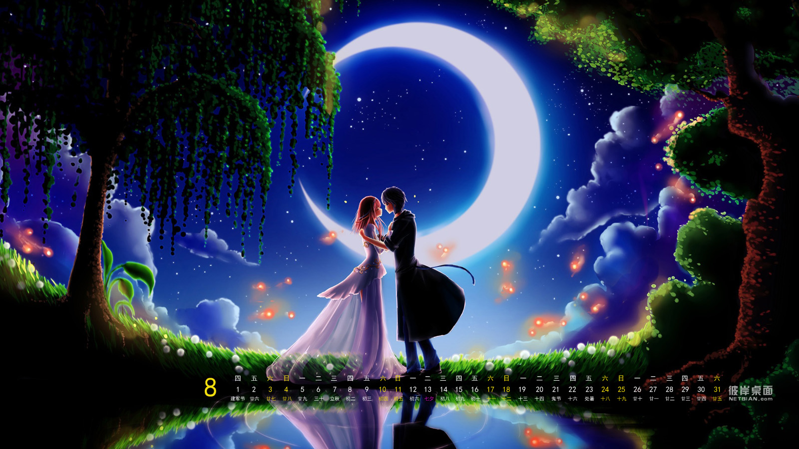 月光亲吻之浪漫七夕2013年8月日历电脑壁纸